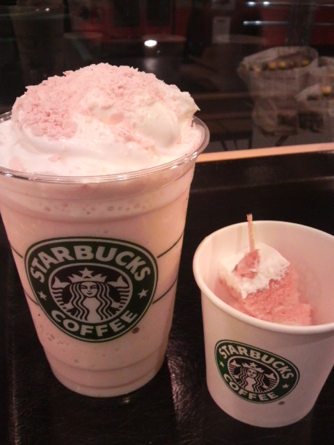 春限定のスタバの桜クリームフラペチーノ☆と店員さんが試食でくれた桜シファンケーキ☆